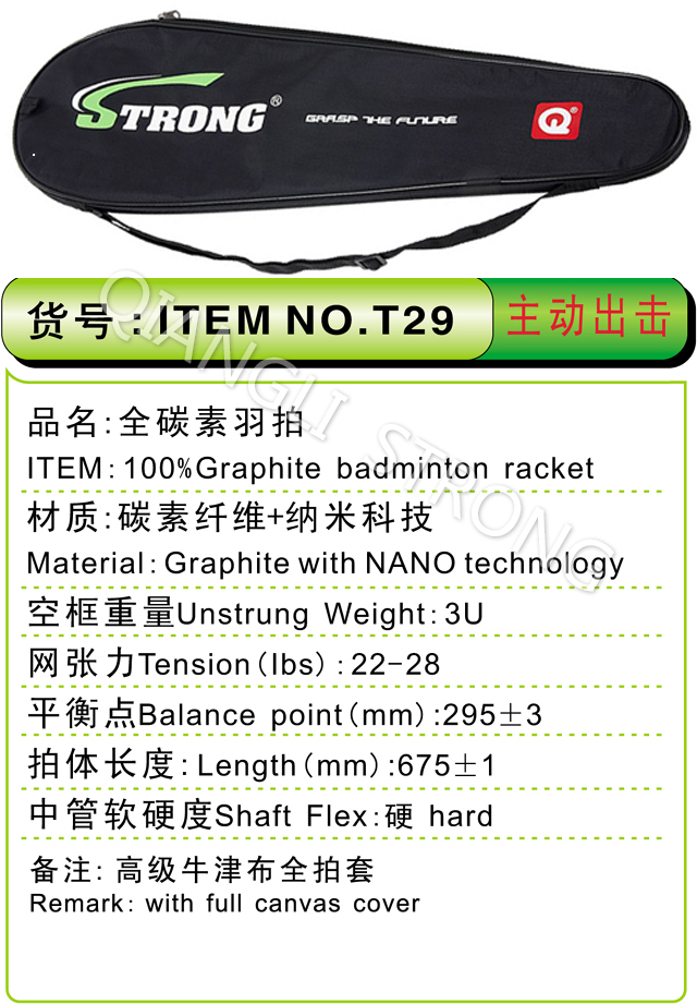 品名:T29全碳素羽拍 ITEM:100%Graphite badminton racket 材质:碳素纤维+纳米科技 Material:Graphite with NANO technology 空框重量Unstrung Weight:3U(85-89g) 网张力Tension(lbs):22-28 平衡点Balance point(mm):295+/-3 拍体长度:Length(mm):675+/-1 中管软硬度Shaft Flex:硬 hard 备注:高级牛津布全拍套 Remark:with full canvas cover |