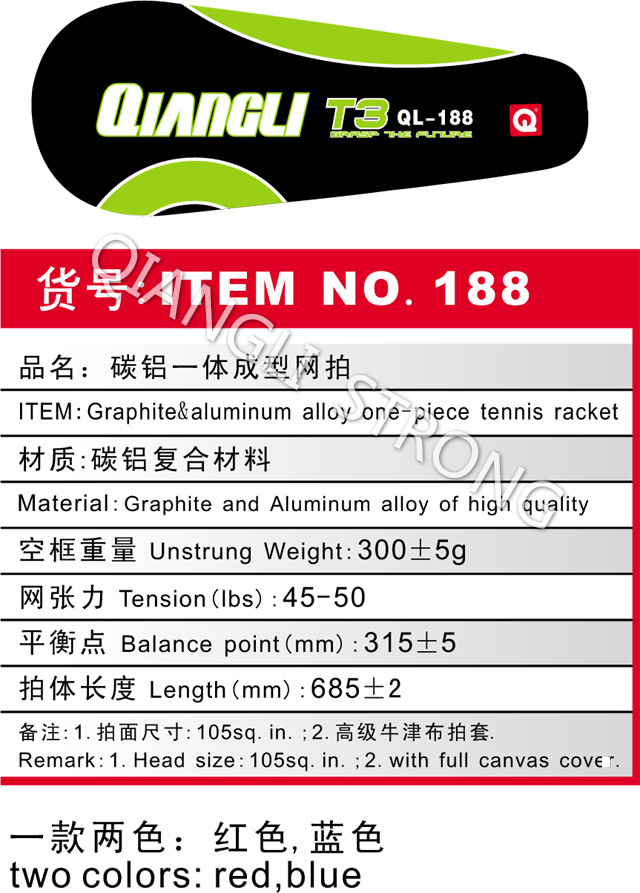 货号:ITEM NO.188 品名:碳铝一体成型网拍 Item:Graphite & Aluminum alloy one piece tennis racket 材质:碳铝复合材料 materia:graphite and aluminum alloy of high quality 空框重量 unstrung weight:300+/-5g 网张力tension(lbs):45-50 平衡点balance point(mm):315+/-5 拍体长度length(mm):685+/-2 备注:1.拍面尺寸:105sq.in.;2.高级牛津布拍套 remark:1.head size 105sq.in.; 2.with full canvas cover |