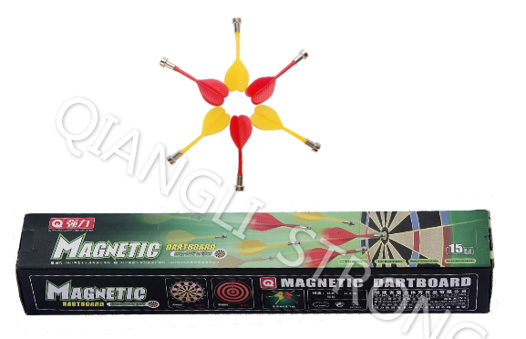 货号:ITEM NO.3195品名:15英寸磁性卷筒飞镖板ITEM:magnetic dartboard 15"材质:铁粉布、丝光布、磁铁、塑料material:iron powder cloth+Mercerized cloth+magnet+plastic尺寸size:425mmX375mm配有6支装磁性飞镖:彩盒包装,16套/箱packing:with 6pcs magnetic darts in color box,16sets/ctn