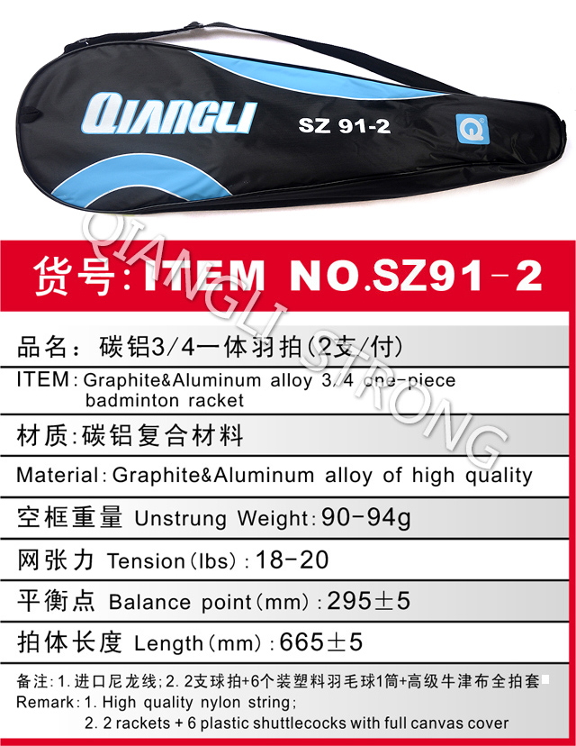 备注:1.进口高级尼龙弦线;2.2支装+一筒羽毛球(6个)+高级牛津布全拍套