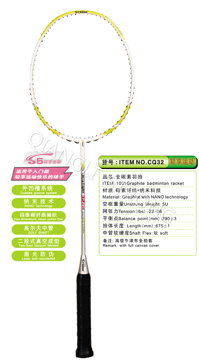 品名:CQ32全碳素羽拍 ITEM:100%Graphite badminton racket 材质:碳素纤维+纳米科技 Material: Graphite with NANO technology 空框重量Unstrung Weight: 5U(75-79g) 网张力Tension(lbs):22-26 平衡点Balance point(mm):290+/-3 拍体长度:Length(mm):675+/-1 中管软硬度Shaft Flex:软 soft 备注:高级牛津布全拍套 Remark:with full canvas cover |