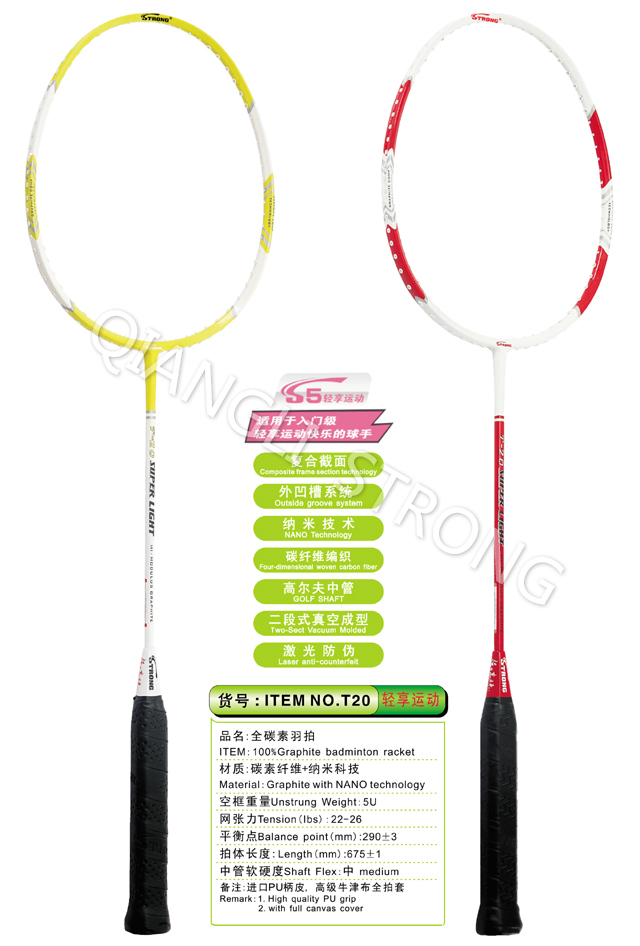 品名:T20全碳素羽拍 ITEM:100%Graphite badminton racket 材质:碳素纤维+纳米科技 Material: Graphite with NANO technology 空框重量Unstrung Weight: 5U(75-79g) 网张力Tension(lbs):22-26 平衡点Balance point(mm):290+/-3 拍体长度:Length(mm):675+/-1 中管软硬度Shaft Flex:中 medium 备注:高级牛津布全拍套 Remark:with full canvas cover |