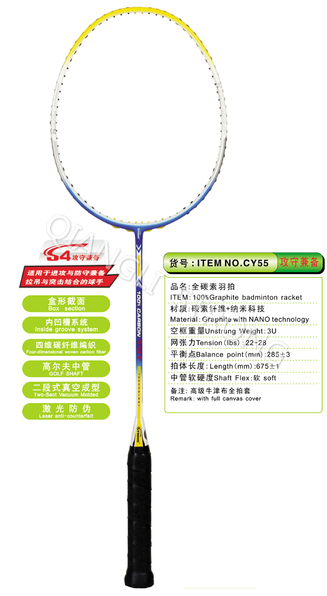 品名:CY55全碳素羽拍 ITEM:100%Graphite badminton racket 材质:碳素纤维+纳米科技 Material: Graphite with NANO technology 空框重量Unstrung Weight: 3U(85-89g) 网张力Tension(lbs):22-28 平衡点Balance point(mm):285+/-3 拍体长度:Length(mm):675+/-1 中管软硬度Shaft Flex:软 soft 备注:高级牛津布全拍套 Remark:with full canvas cover |